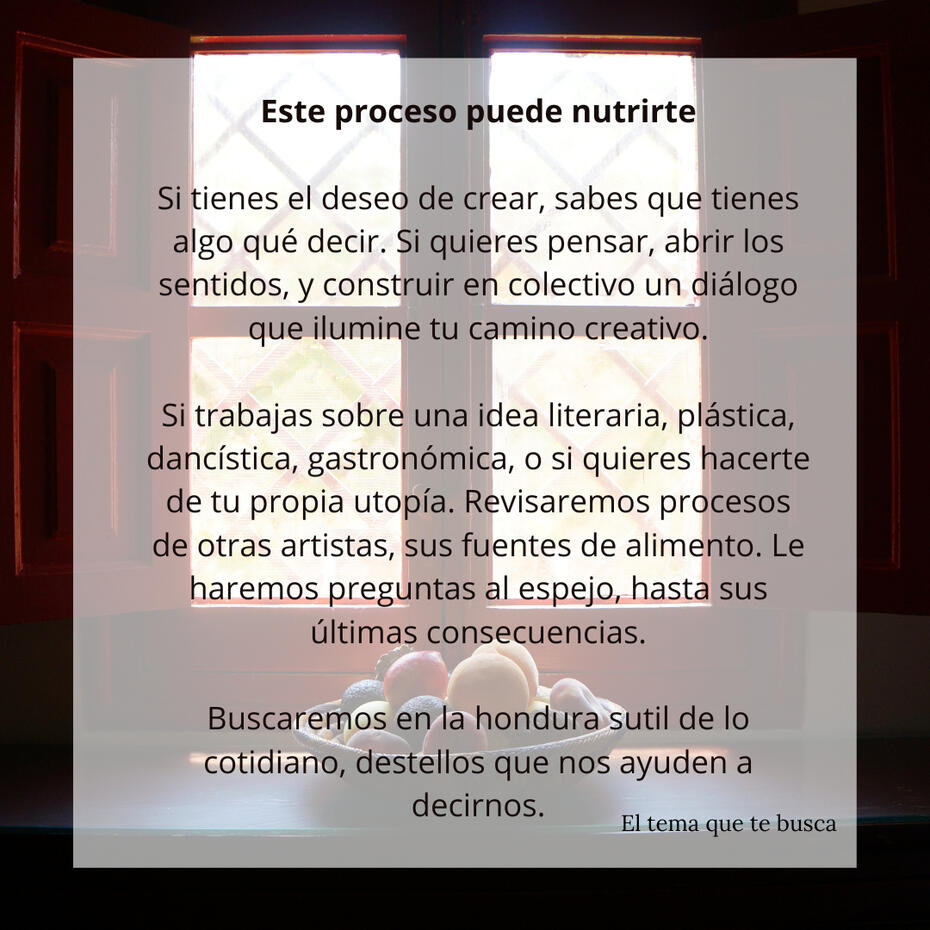 Este taller trabaja el tema de la maternidad, está dirigido a madres que deseen abrir grietas de posibilidad y tiempo para ellas mismas. Es un espacio seguro de escucha, contención, registro y desarrollo de ideas, que sabemos, toman su tiempo gestándose para poder un día,nacer. Su ritmo, formato, dedicación y apertura están diseñados para adaptarse a las dificultades de tiempo naturales en quienes maternamos.